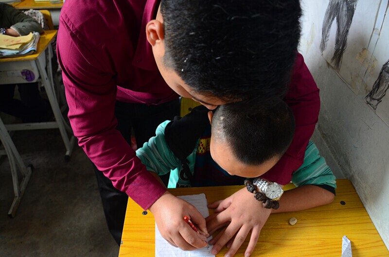 在和這些孩子們的接觸過程中,我們發(fā)現(xiàn),雖然他們的生活條件不是太好,自身或多或少的有些殘疾,但這些孩子并沒有我們之前所想象的那樣孤僻,反而是個(gè)個(gè)面帶著燦爛的笑臉,保持著積極樂觀的生活態(tài)度。這些孩子中有的畫畫的很好,有的字寫的很漂亮,還有的孩子興高采烈地拉著我的手讓我給他照相……我們所有人都融入到這群孩子當(dāng)中,教給他們寫字,和他們一起玩耍、做游戲,而他們也教會(huì)了我們不管生活有多艱苦,都應(yīng)該報(bào)以一顆感恩的心去勇敢地面對(duì)生活。