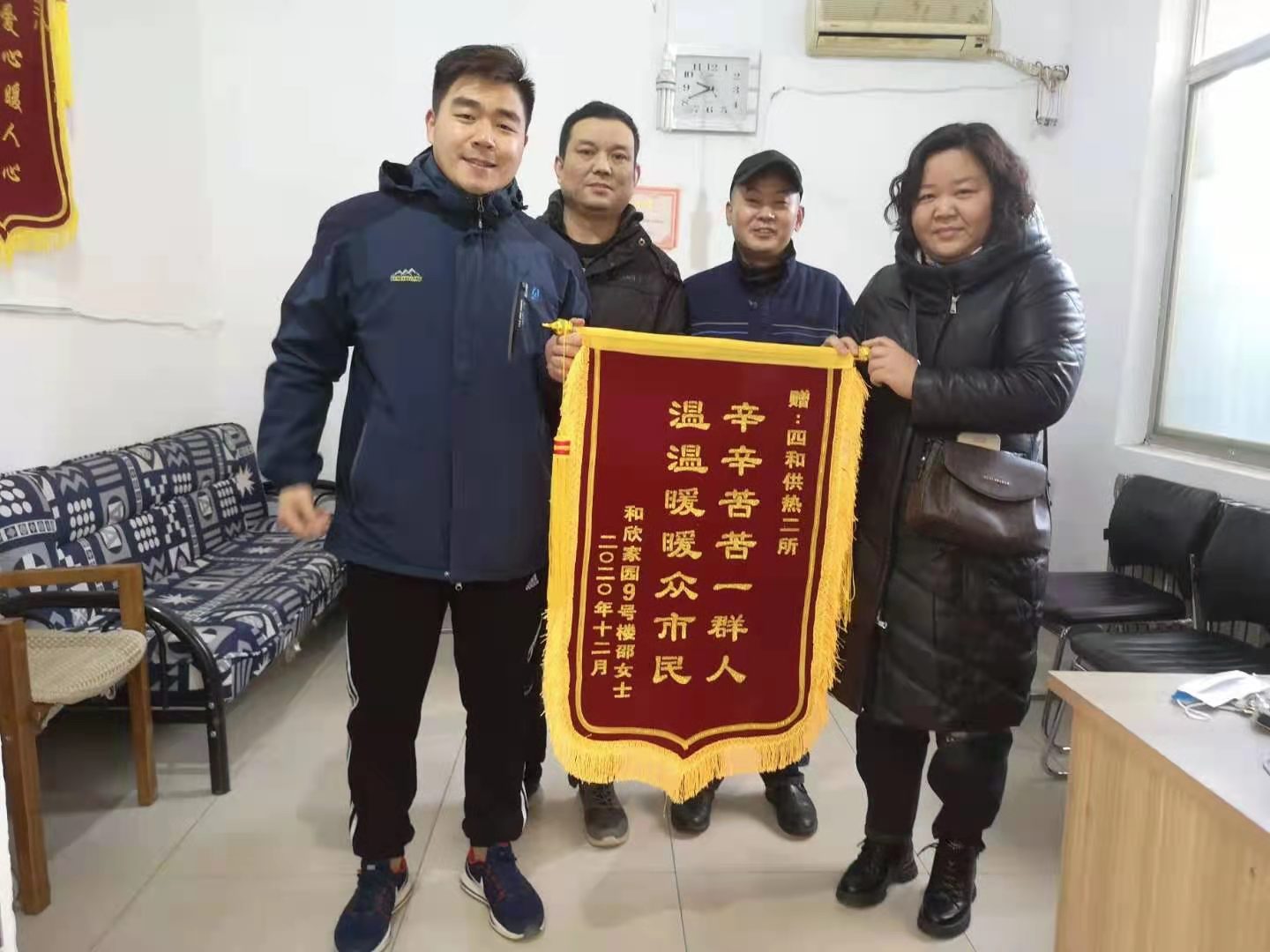 采暖季以來(lái),水韻城、和欣家園、如意印染廠小區(qū)、胡營(yíng)運(yùn)河宜居佳苑小區(qū)等多個(gè)小區(qū)的業(yè)主代表陸續(xù)將錦旗送到濟(jì)寧四和供熱有限公司,對(duì)該公司為小區(qū)供暖做出的貢獻(xiàn)表示感謝。