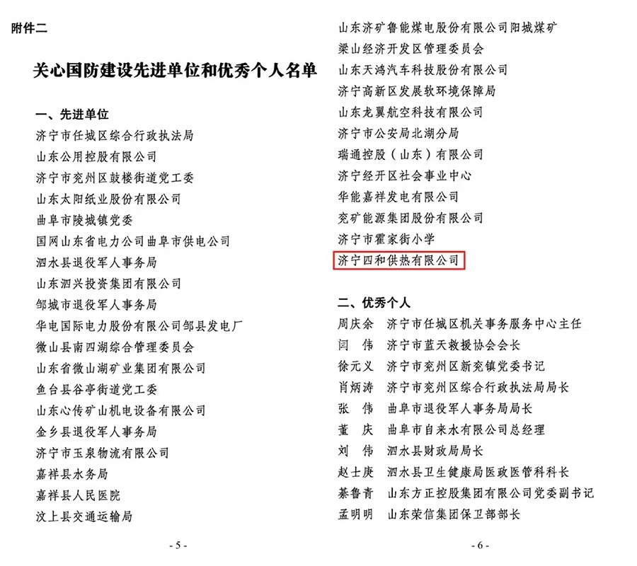 近日,中共濟(jì)寧市委辦公室下發(fā)了《關(guān)心國防建設(shè)先進(jìn)單位和優(yōu)秀個(gè)人名單》,濟(jì)寧四和供熱有限公司榮獲關(guān)心國防建設(shè)先進(jìn)單位榮譽(yù)稱號(hào)。